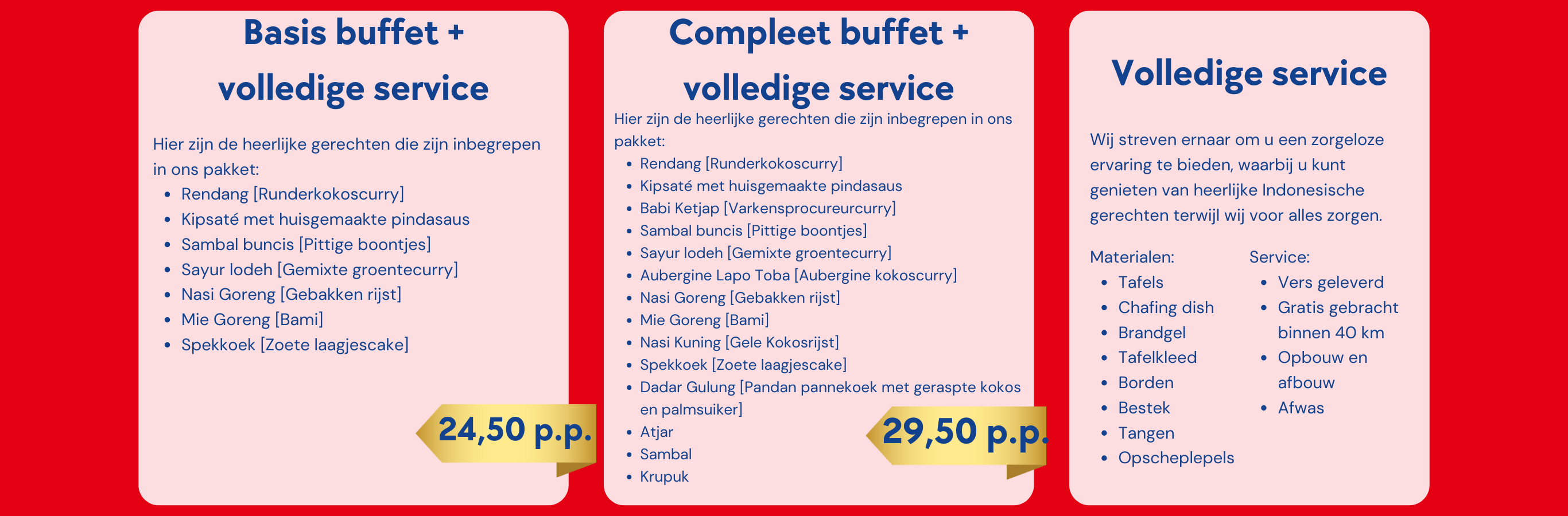 Welkom bij Toko Lapo Toba catering, uw full-service Indonesische buffet cateringbedrijf voor groepen vanaf 15 personen. Geniet van een authentieke culinaire ervaring met onze heerlijke Indonesische gerechten, terwijl wij zorgen voor alle aspecten van de catering. Ontdek de smaken van Indonesië en laat ons uw volgende evenement onvergetelijk maken. Vul het contactformulier in en ontvang binnen 24 uur een offerte.
